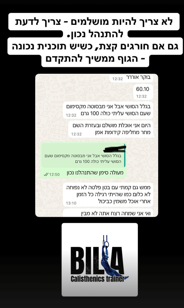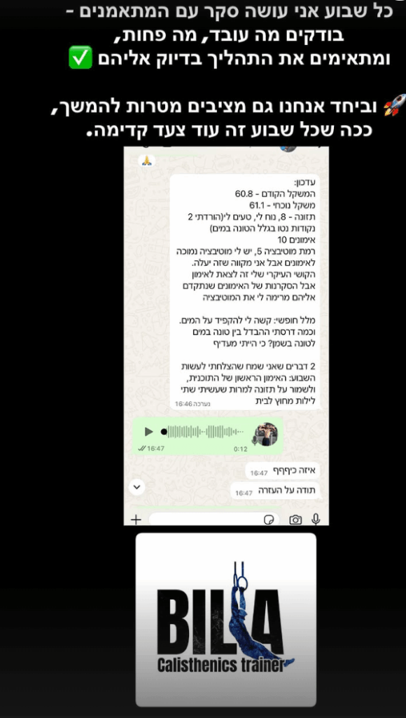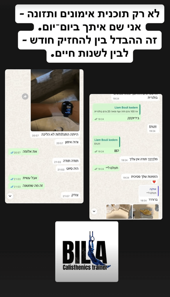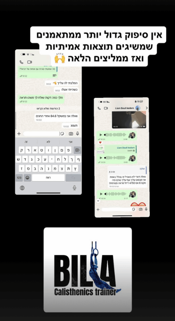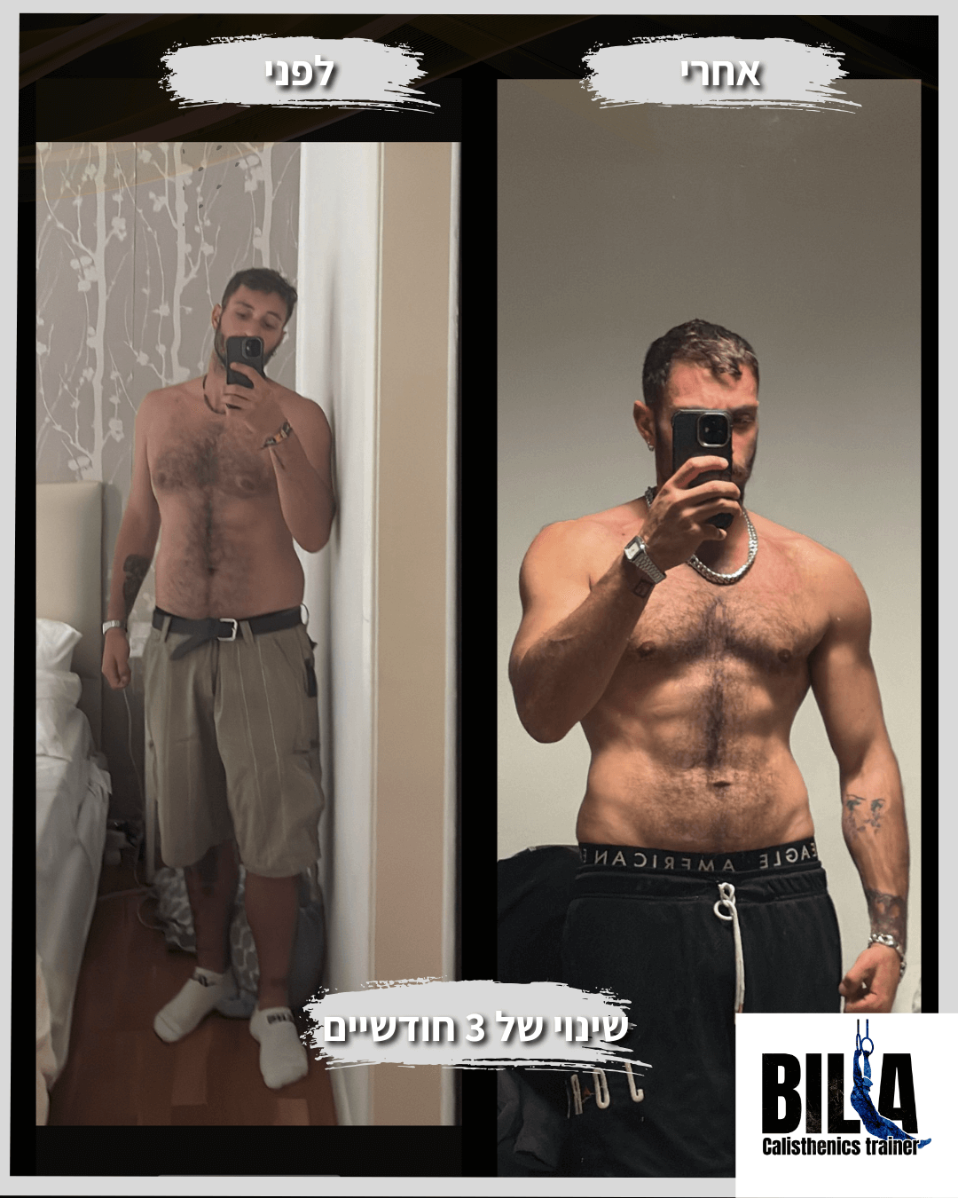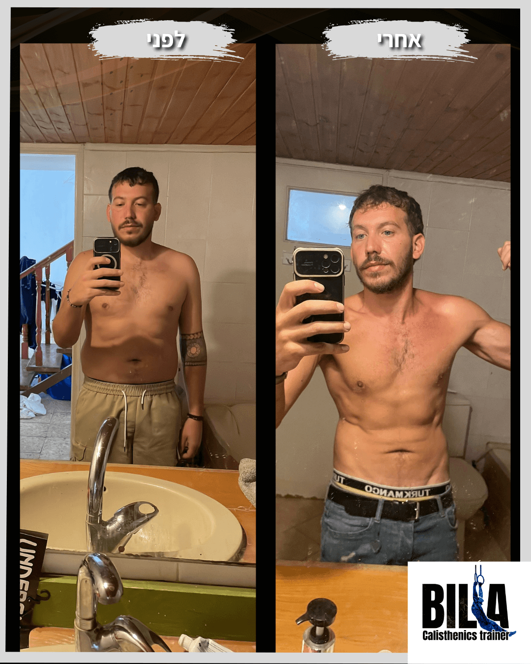ליאם התחיל כשהוא בקושי מצליח לעשות מתח אחד ותוך סך הכל חודשיים וחצי הוא ירד 11 קילו, הגיע לריבועים וגוף מטורף והיום הוא מצליח לעשות תרגילים מתקדמים כמו עמידות ידיים ועליות כוח!